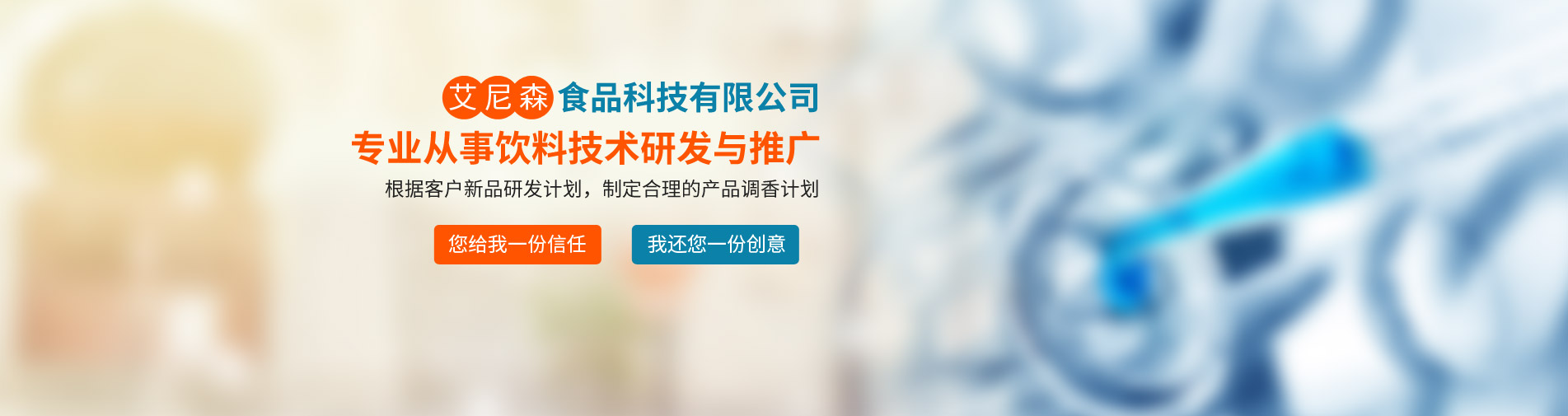 廊坊市艾尼森食品科技公司是一家專(zhuān)業(yè)從事飲料技術(shù)研發(fā)與推廣的公司,公司業(yè)務(wù)主要包括食品飲料技術(shù)咨詢(xún)與服務(wù)、產(chǎn)品定位與現(xiàn)有產(chǎn)品品質(zhì)改進(jìn)、新產(chǎn)品技術(shù)工藝研發(fā)等。公司坐落于京津冀核心地帶--廊坊市,位置得天獨(dú)厚,現(xiàn)與京津多家研究所形成戰(zhàn)略合作關(guān)系,為多家上市公司及知名企業(yè)提供技術(shù)支持與原材料供應(yīng)。